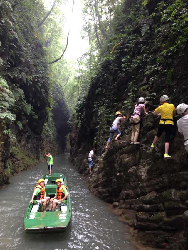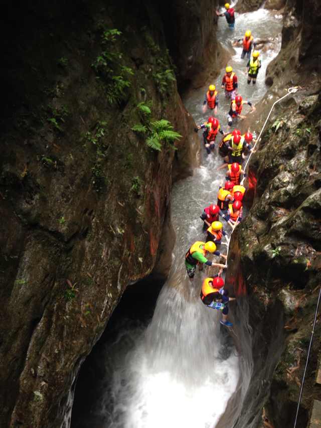 行至峡谷中段攀岩漂流处,天空中依旧飘着零星细雨,用手试探了一下漂流的水温,冰凉的河水,心顿时拔凉拔凉的,已然打起了退堂鼓。但还是有10多名勇士和数名女汉子,不惧悬崖峭壁和冰凉的河水,攀爬于悬崖峭壁之上,漂流于冰凉汹涌的峡谷河水之中,惊险刺激、一幕接一幕,真是勇者无畏,玩的就是心跳。